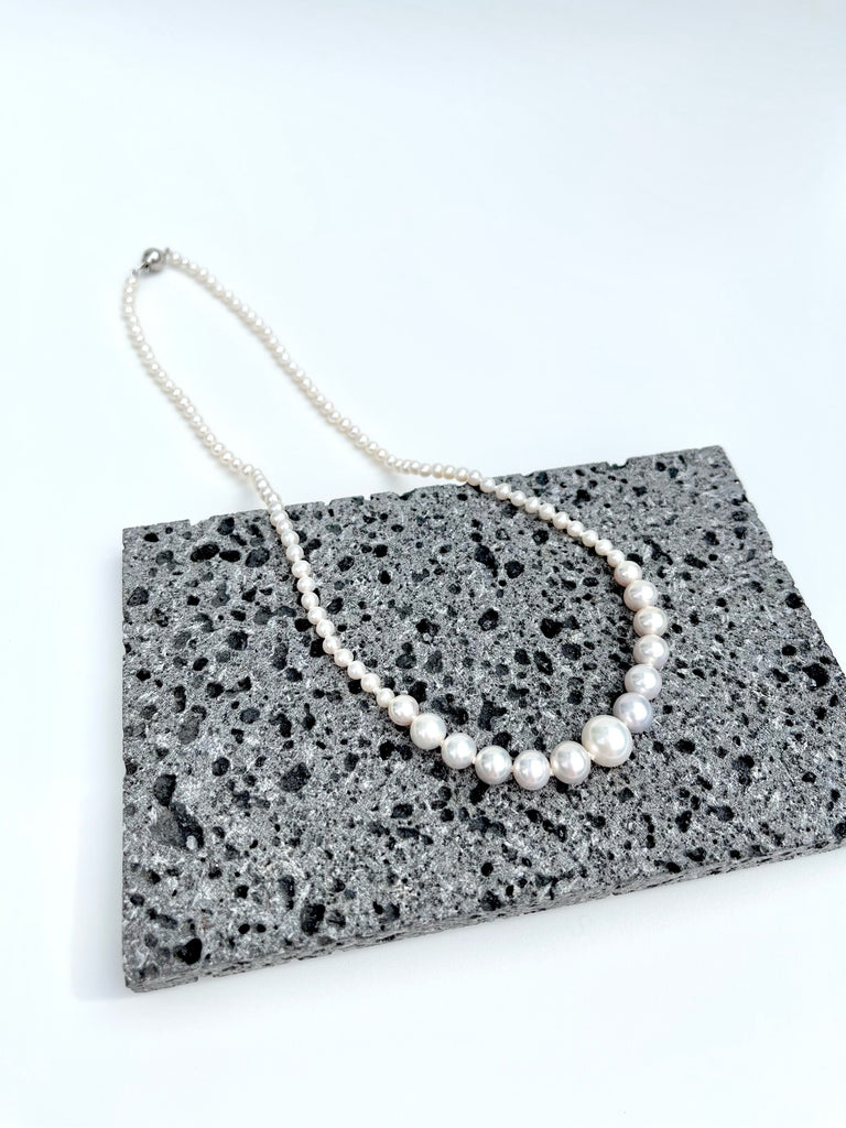 The stunning design of this necklace showcases the beauty of these extraordinary pearls, gracefully transitioning from smaller to larger pearls to create a harmonious and eye-catching piece.
