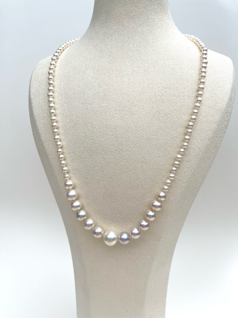 Introducing our extraordinary Coreless Graduated Pearl Necklace, a breathtaking piece featuring 3-10mm graduated pearls, meticulously hand-strung on 100% silk thread and hand-knotted between each pearl for added security and elegance.