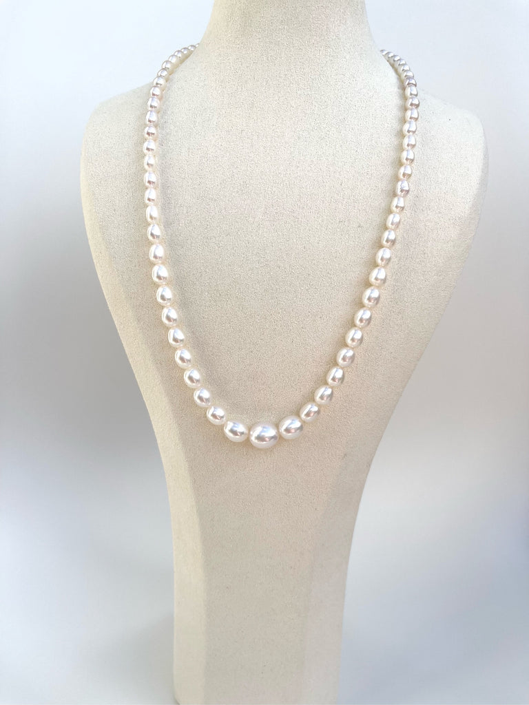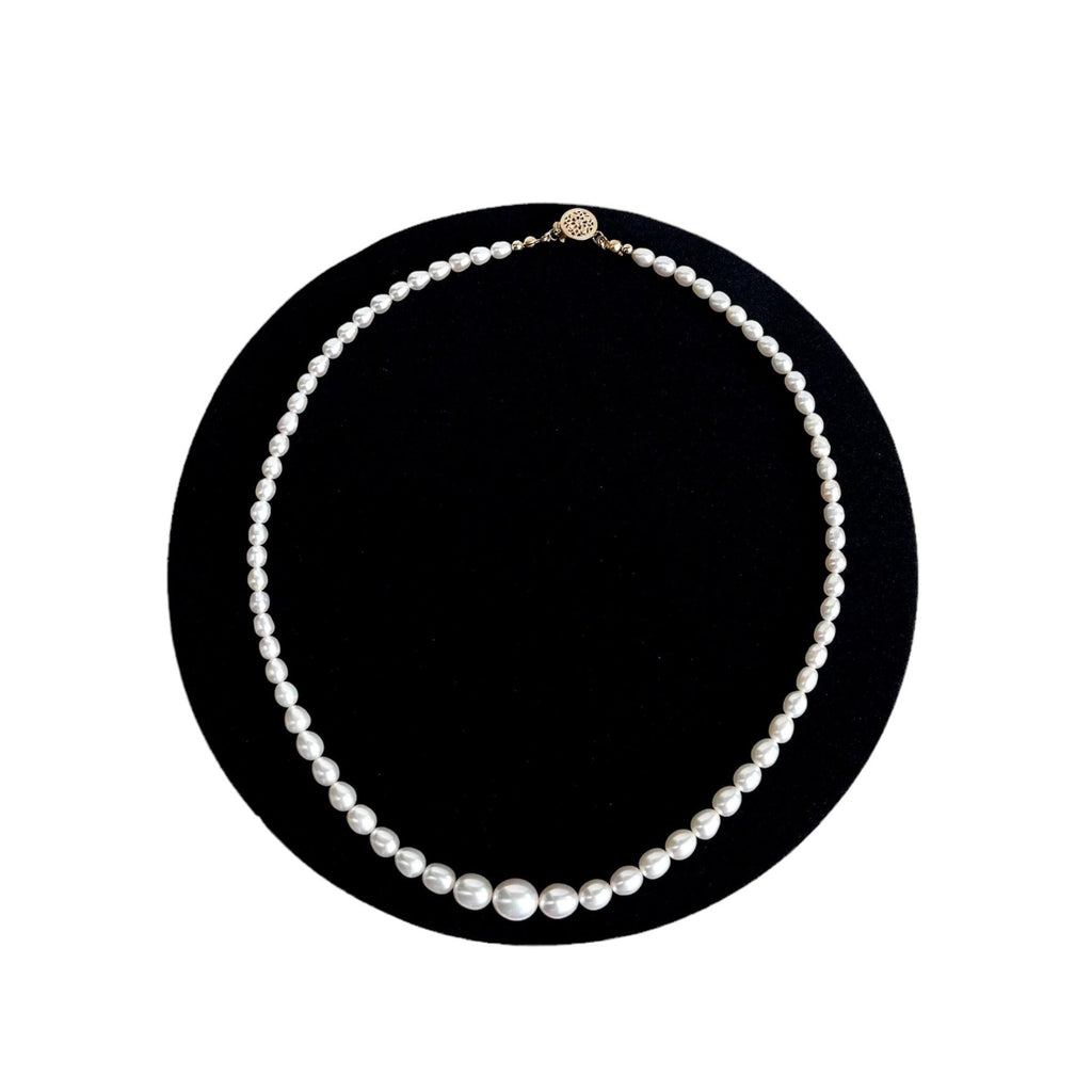 Beautifully necklace featuring graduated rice-shaped pearls, each selected for its clean surface and unparalleled lustre. These luminous pearls are harmoniously strung together, transitioning seamlessly in size, creating a timeless flow that sits gracefully against the collarbone. The necklace is exquisitely finished with a lustrous gold clasp, adding an extra touch of sophistication to the piece.