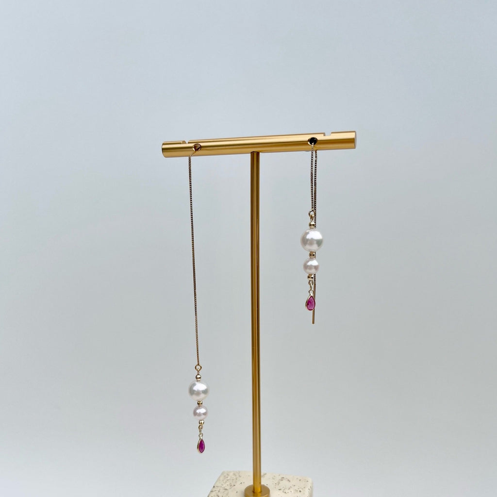 Elevate your style with our exquisite Japanese Akoya Pearl and Ruby Threader Earrings, featuring two different sizes of perfectly round Japanese Akoya pearls and a ruby charm, all set on a 14-karat gold chain.