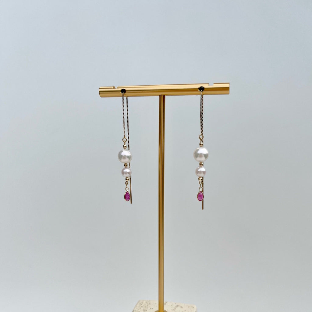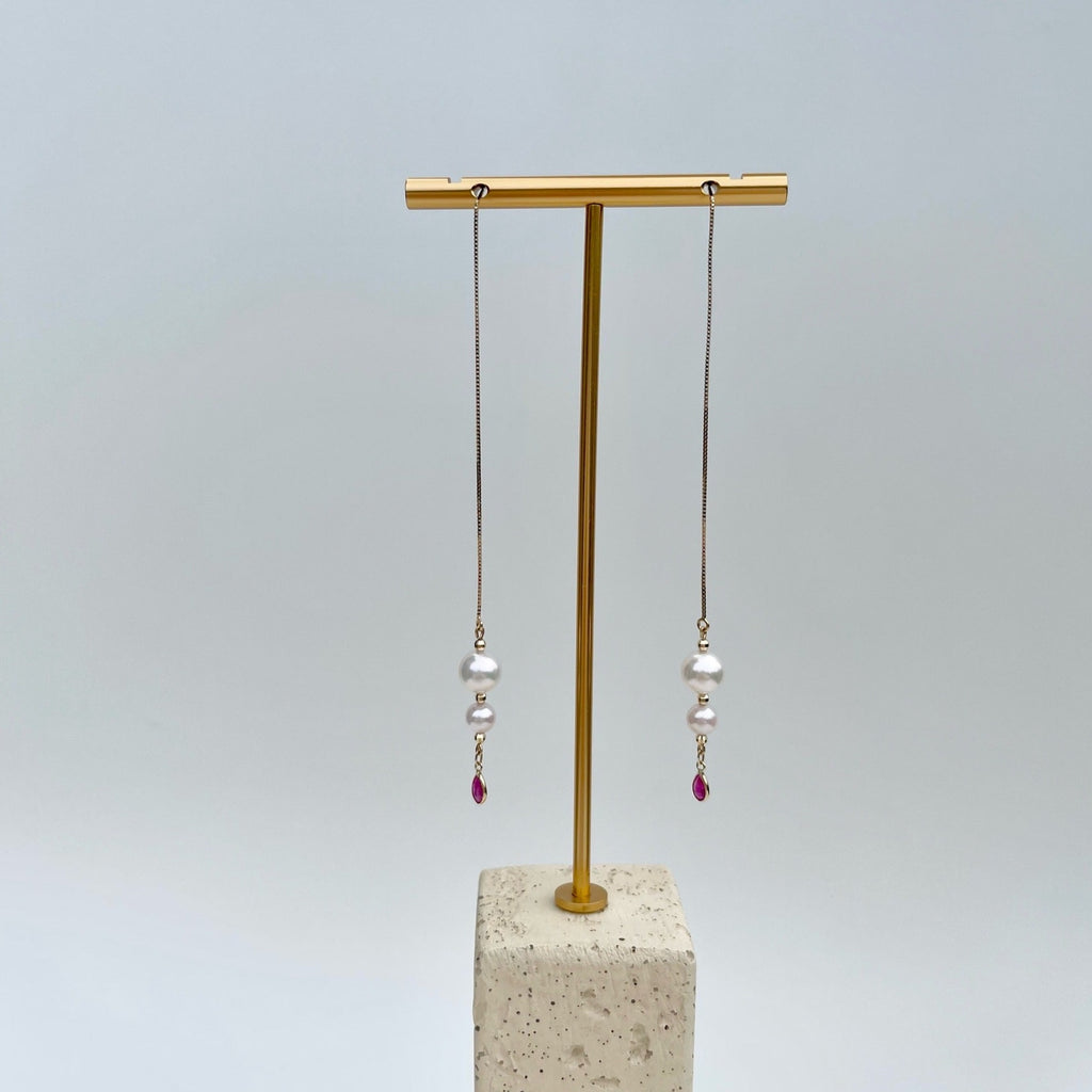 Japanese Akoya Pearl and Ruby Threader Earrings | 14 Karat Gold