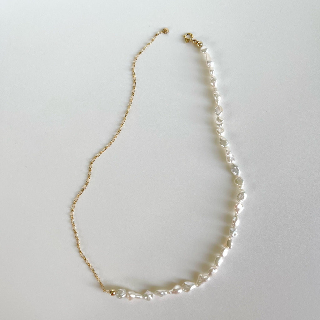 This artfully designed necklace features one half with a dainty chain, while the other half highlights the Keshi pearls. The juxtaposition of the sleek chain and the organic pearls creates a captivating visual contrast that exudes a sense of refined sophistication.