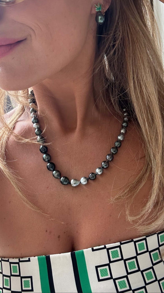 The necklace boasts an enchanting palette of silver-grey to dark green hues, the pearls' mesmerizing coloration echoing the captivating beauty of their island origin. The unique color gradient enhances the individuality of each pearl, mirroring the mysterious allure of the South Pacific waters.
