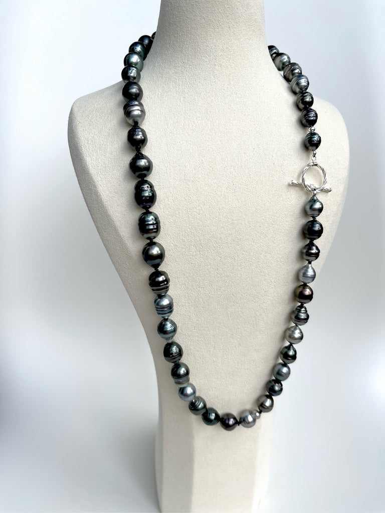 The Tahitian baroque pearls are hand-strung and individually knotted on a 100% black silk threader, providing a striking contrast that beautifully highlights their unique coloration. This meticulous method of hand-knotting ensures the pearls' security and adds a touch of elegance, allowing each pearl to stand out as an individual piece of beauty while contributing to a harmonious overall design.