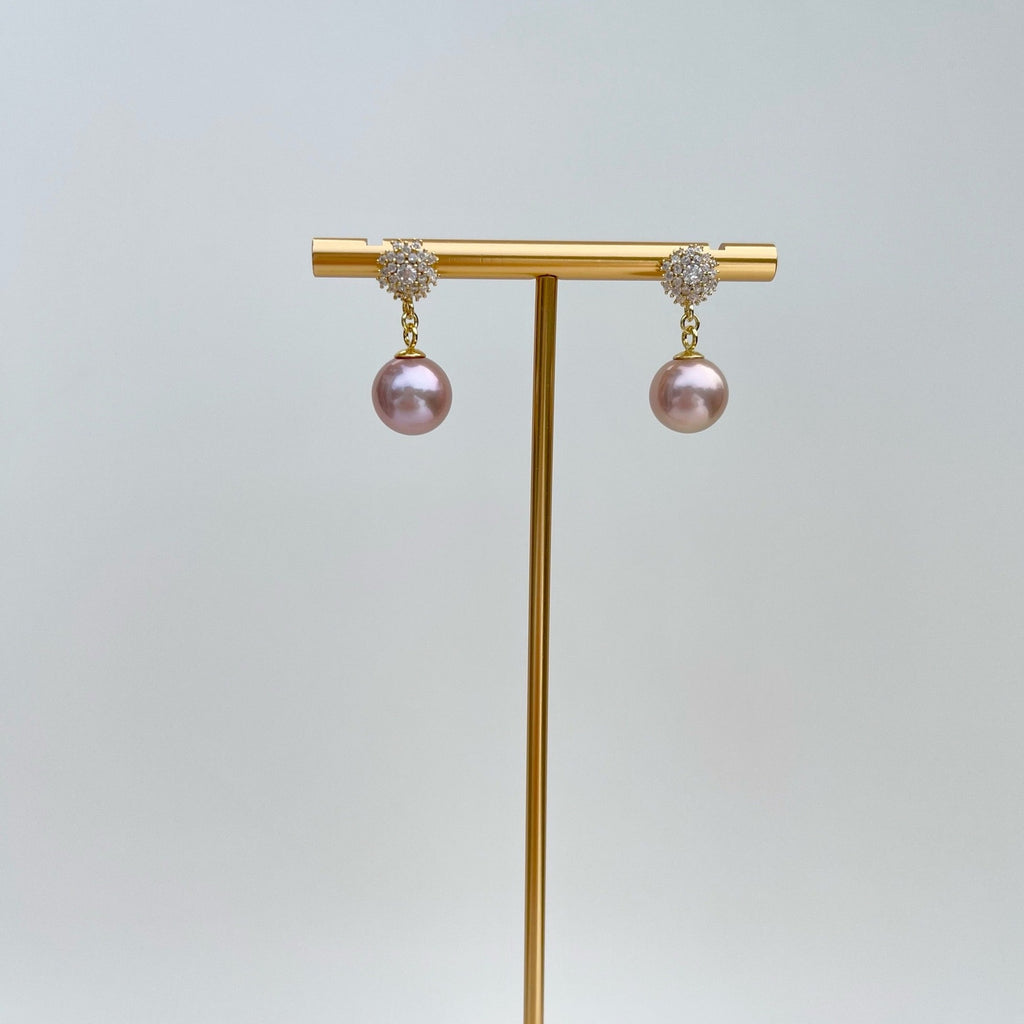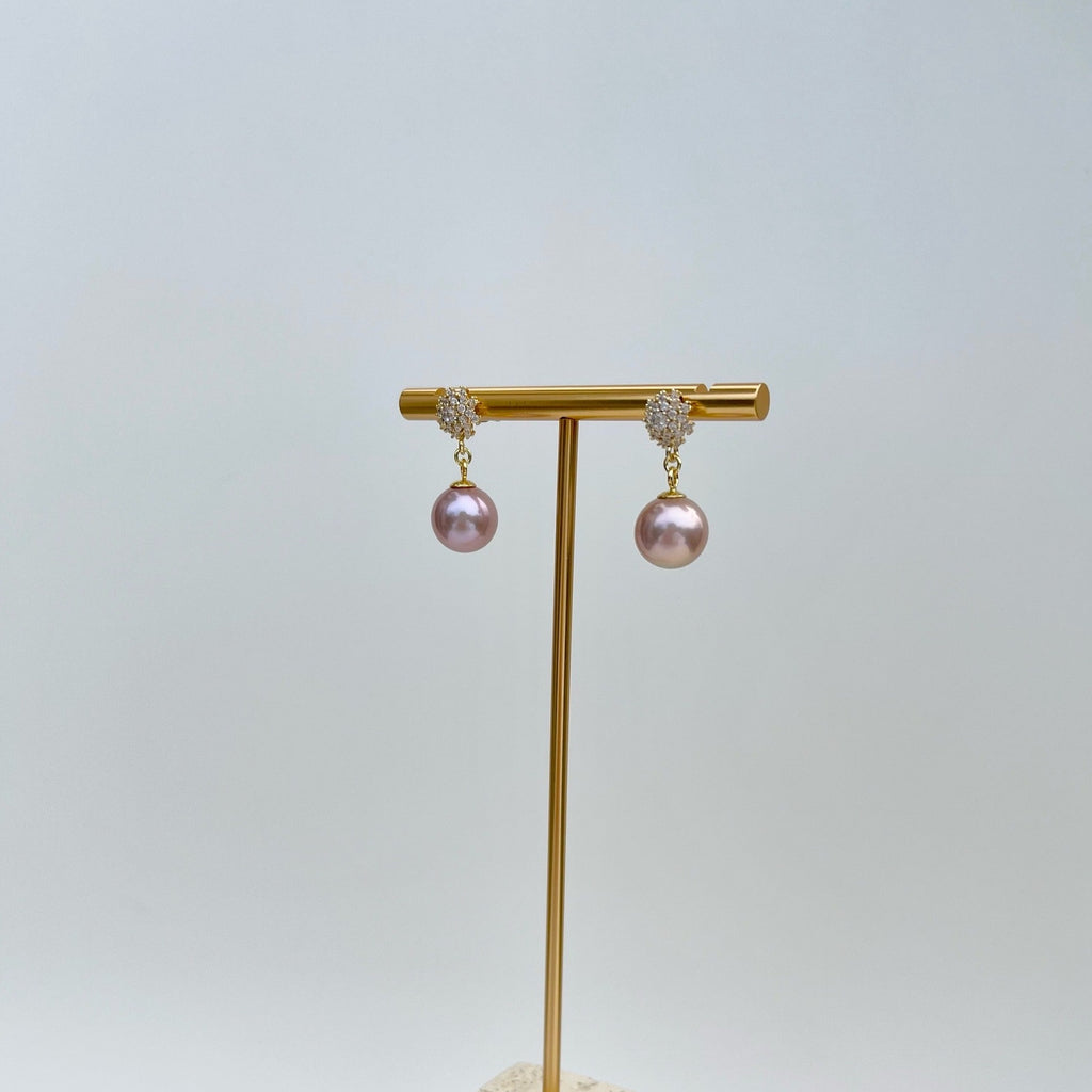 Super shining cubic zirconia studs, elegantly complemented by a large natural rose-colored pearl dangling below.