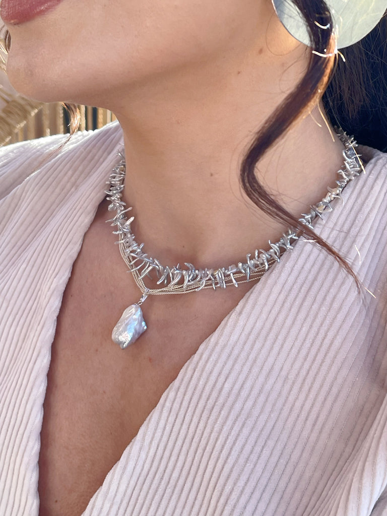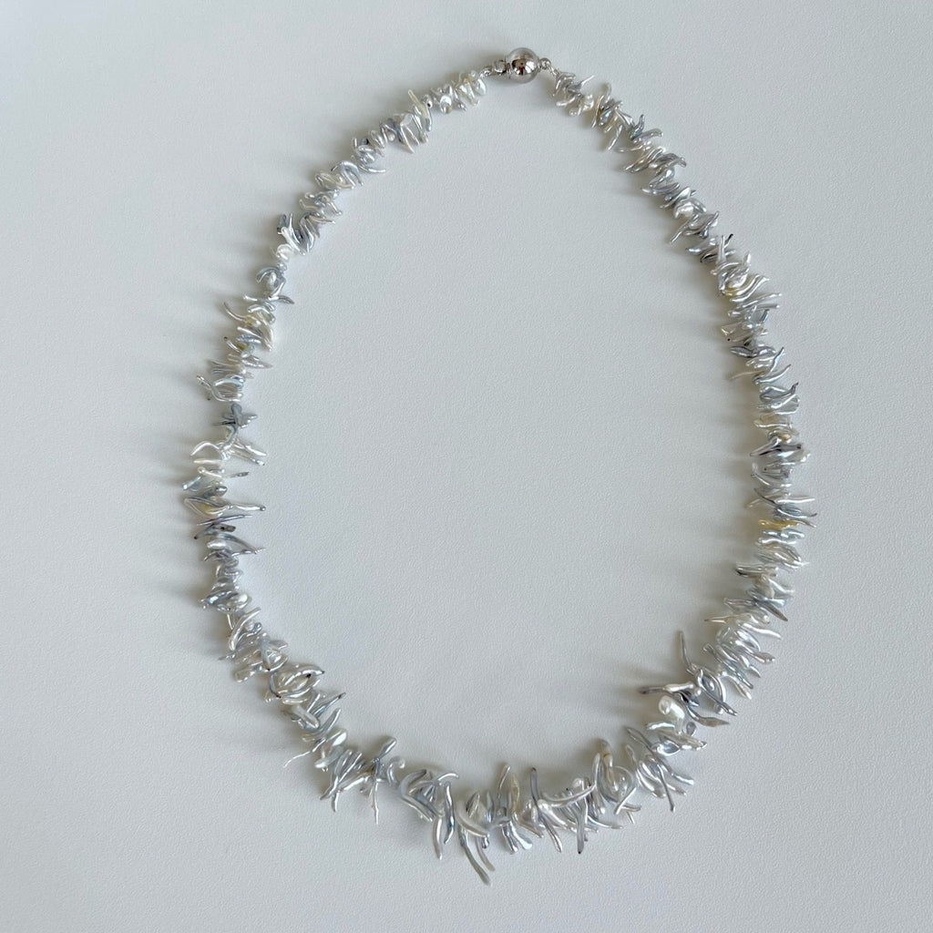 Each keshi pearl is hand-selected for its distinctive long stick shape, offering an intriguing and extraordinary aesthetic that sets this necklace apart from others.