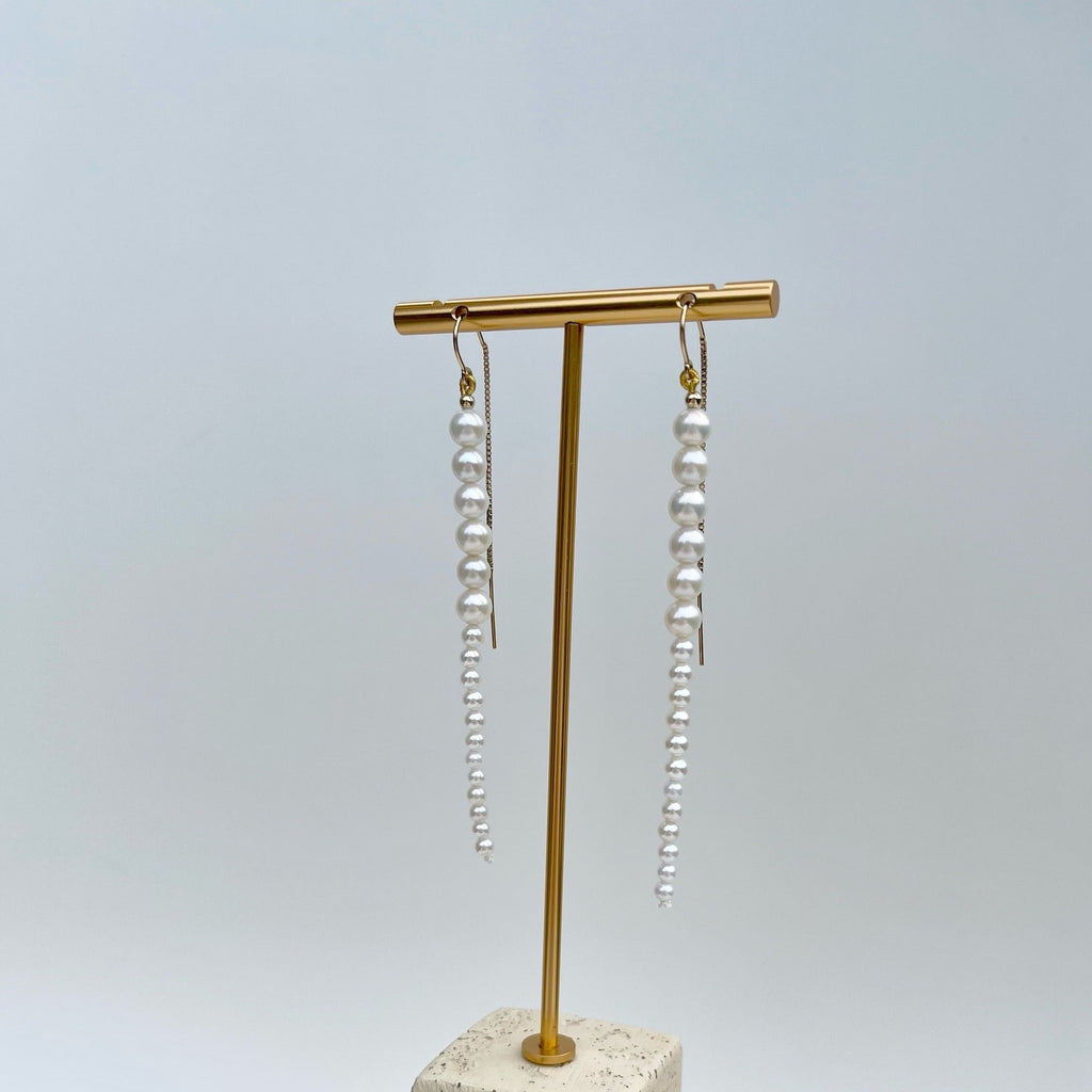 Stunningly handcrafted Akoya pearl threader earrings, featuring two different sizes of natural Akoya pearls.